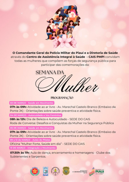 A Polícia Militar do Piauí, por meio da Diretoria de Saúde e do Centro de Assistência Integral à Saúde da PMPI (CAIS), promove, no período de 03 a 13 de março, o projeto “Semana da Mulher – CAIS”. A ação é direcionada às policiais militares e servidoras que integram as forças de segurança pública, com uma programação especial voltada à promoção da saúde, valorização profissional e fortalecimento da identidade feminina no ambiente institucional.
