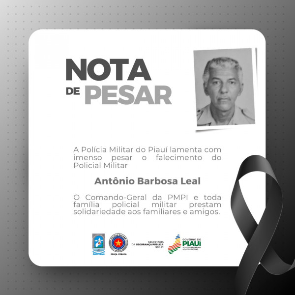 A Polícia Militar do Piauí manifesta profundo pesar pelo falecimento do 3º Sargento da Reserva Antônio Barbosa Leal, que dedicou 30 anos de sua vida à corporação, prestando relevantes serviços à segurança pública do estado.