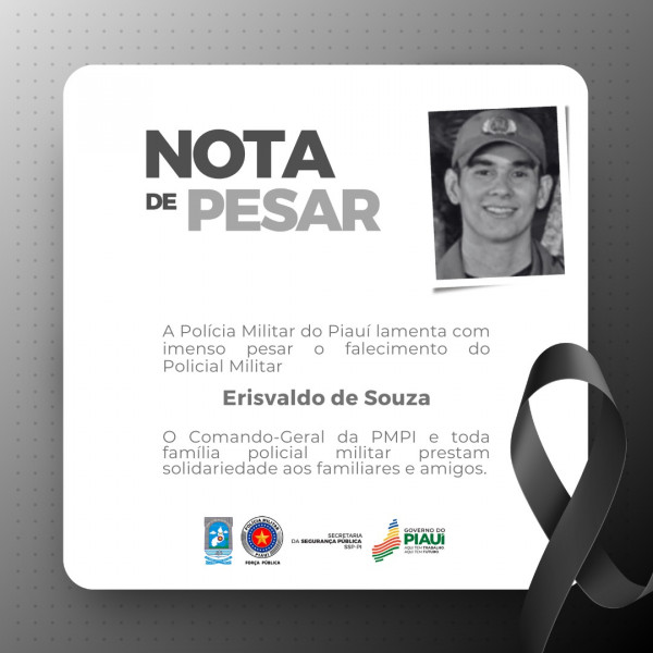 É com imenso pesar que a Polícia Militar do Piauí lamenta o falecimento do Policial Militar Erisvaldo de Souza ocorrido nesta sexta (06).