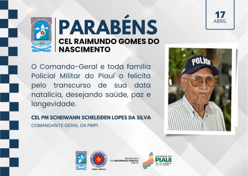 A Polícia Militar do Piauí celebra, nesta data, o aniversário do Cel Raimundo Gomes do Nascimento.
